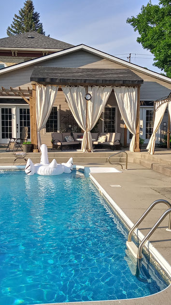 Our spacious patio has several covered and open functional areas that provide an opportunity for outdoor dining and enjoying the sun alongside the heated in-ground pool in zero gravity chairs. Or grab a book or magazine from our Library and relax in the shaded Cabana. Main floor Change Room, which is a full bathroom with pool towels and a shower, makes the pool experience even more enjoyable. During the blooming season, wisteria and rose petals are floating on the pool surface providing a sublime swimming experience.